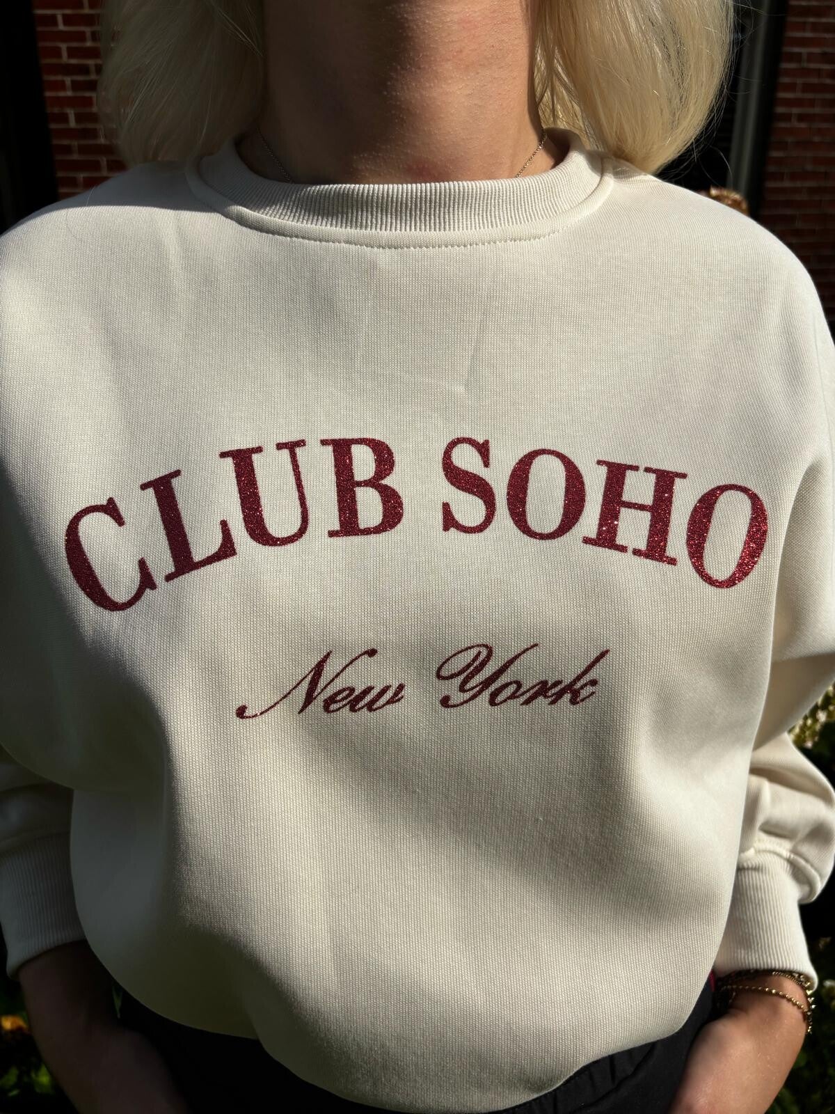 Deze beige sweater valt op maat en is one size, geschikt voor maat S, M én L. De rode glittertekst geeft ‘m een opvallende, stijlvolle touch. Dankzij de dubbele voering voelt hij extra comfortabel en warm aan.